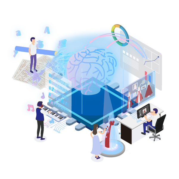 映像解析・音声解析・データ解析などの解析AIに加え、文章・画像・コード生成などの生成AIを活用したシステム開発を提供。
